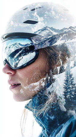 Double exposure Portrait of a skier with mountain reflections in goggles on a snowy day