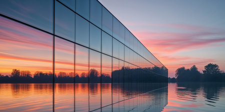AI Generated. Modern glass building reflecting sunset on calm waterscape beautifully