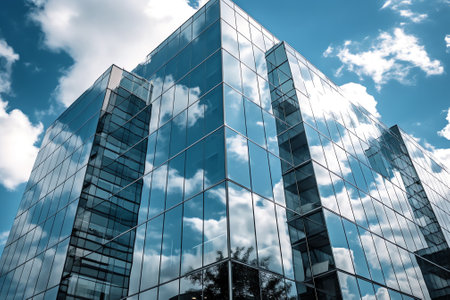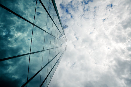 detail of modern corporate office building with glass and steel reflecting blue sky and clouds