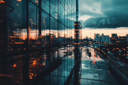 The image showcases the exterior of a contemporary building with large reflective windows. The glass panels mirror a cityscape with tall structures and street lights, bathed in warm sunlight. The composition emphasizes geometric lines and symmetry. It could be used for architecture, business, or urban design related projects.