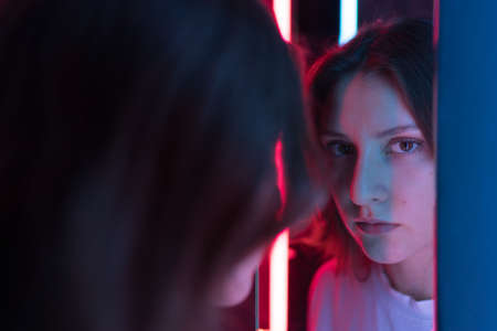 A female portrait in the reflection of a neon mirror. Beautiful woman look at the camera