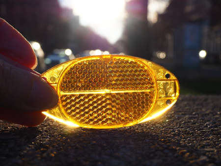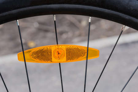Fragment of bicycle wheel with plastic reflector orange color installed between the spokes