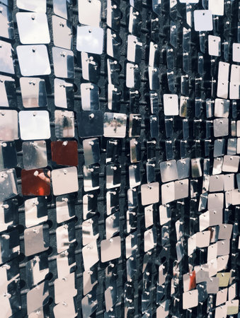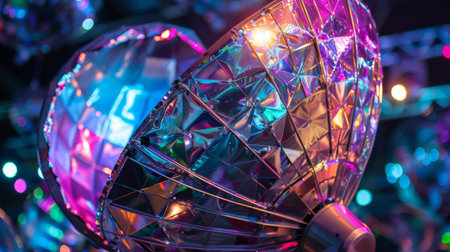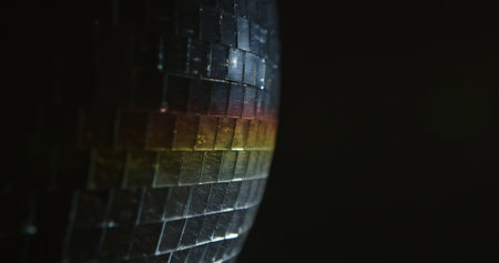 A close up image capturing the shimmering reflective tiles of a disco ball, showing vibrant colors.