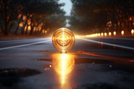 Glass ball on the road at sunset. Conceptual image. 3d rendering.