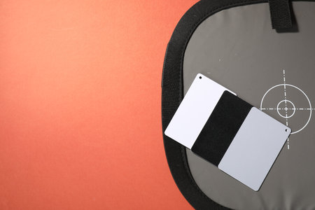 Professional reflectors on floor near gray wall, space for text. Photo studio equipment