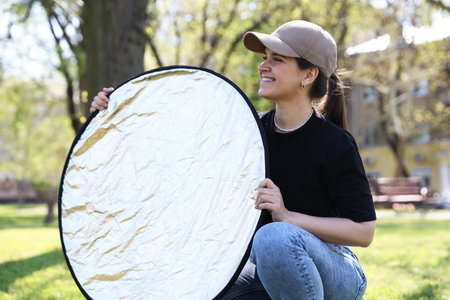 Standard reflector with matt white and yellow diffuser on a white background. Different diffusers for light temperatures. Attachment for studio flash with bowens mount.