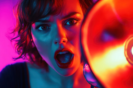 Dramatic close-up of woman with intense expression and bold lipstick shouting into megaphone, vibrant colors and dynamic energy.