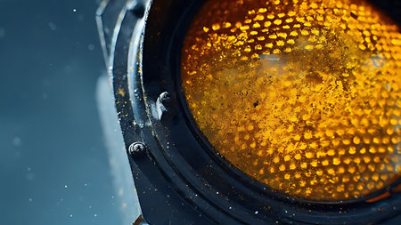 Traffic light amber with neon light. Close-up detail of fresnel lens texture and caution signal.