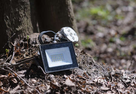 Modern LED twin spotlight against green grass. Lighting equipment, outdoor Floodlight. Copy space for text.