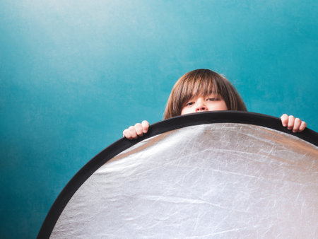 Child playing with the reflector during the photo session in front of the blackboard in a school classroom.