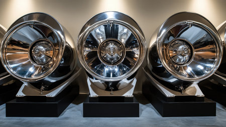 A captivating display featuring a set of vintage automotive superchargers, highlighting their intricate design and polished metal surfaces in a contemporary setting.