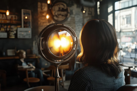 A woman with dark hair sits back, absorbing the warm glow from a vintage lamp while a child plays nearby.