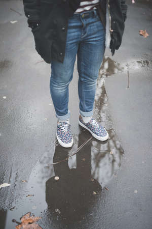 Stepping reflection on the wet pavement . Walking on the rain