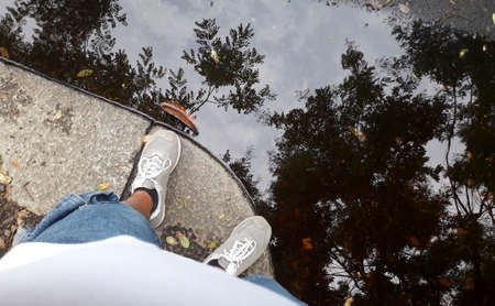 Moscow, Russia - AUGUST 9, 2014: young man with a naked torso rollerblading in Sokolniki Park. Reflection in a puddle