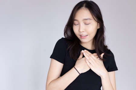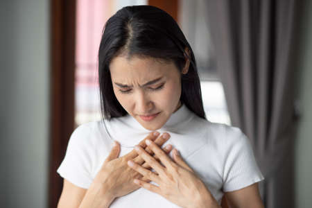 Acid reflux or Gastroesophageal reflux disease (GERD) concept. Young female suffering from heartburn or chest discomfort symptoms. Health care and medical concept. Close up. Copy space.