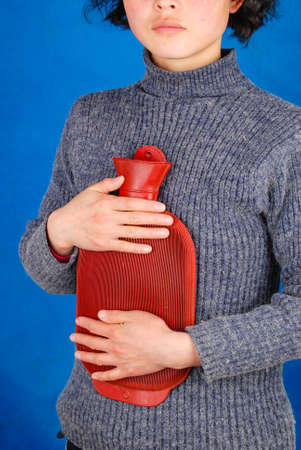 Woman Experiencing Menstrual Cramps Holding Hot Water Bottle for Pain Relief on Sofa at Home, Concept of Menstruation, Period Pain, and Womens Health