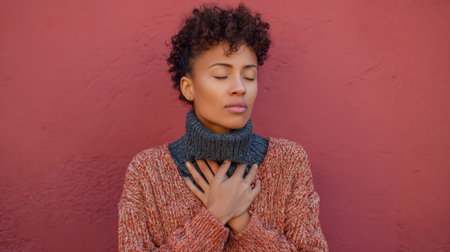 A woman sits peacefully with her eyes closed, practicing breathing techniques to relieve stress while dressed in a warm sweater near a red wall.