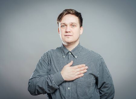 A young man with his hand on his chest, expressing sincerity or emotion.