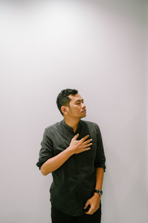 A young man stands indoors with a hand on his chest, expressing deep thought and emotion. His introspective gaze suggests contemplation or gratitude in a warm setting.