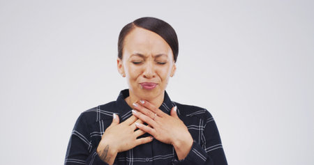 Beautiful caucasian woman touching her collarbone and having bad chest pains against a white background