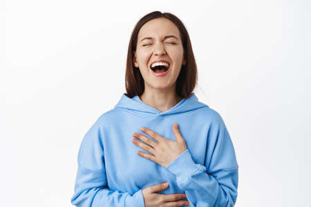 Candid happy girl in hoodie laughing out loud, hold hands on belly and chest while chuckle over smth funny, hilarious joke, standing over white background