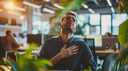 A person with a hand on his chest, showing a painful expression, in a coworking space generative ai