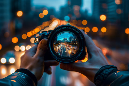 Capturing urban cityscape through camera lens with mesmerizing bokeh effect in blue and orange tones