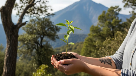 Two hands cradle a small plant with soil, set against a backdrop of rolling, green hills. The image features a shallow depth of field, bringing the seedling into sharp focus. The scene, illuminated by natural light, evokes a sense of environmental responsibility and nature's beauty. Suitable for themes of growth and conservation.