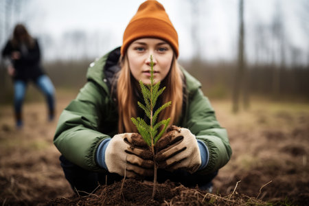 shot of a young woman holding up a seedling during tree planting, created with generative ai