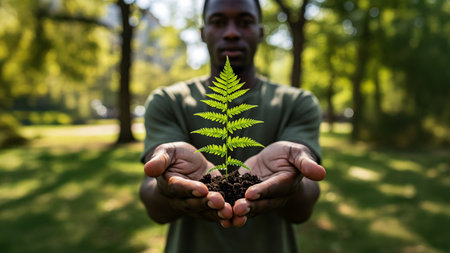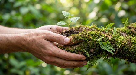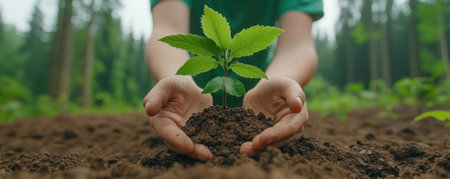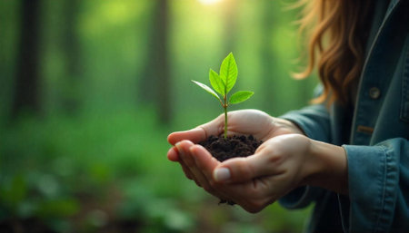 A close-up view of hands cradling rich soil with a young seedling, symbolizing growth and environmental stewardship in a vibrant natural setting.