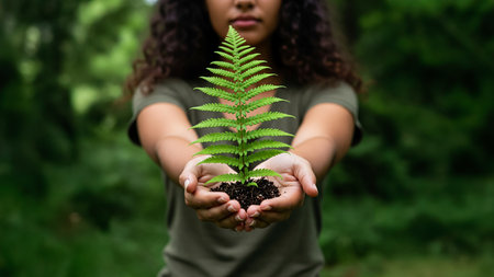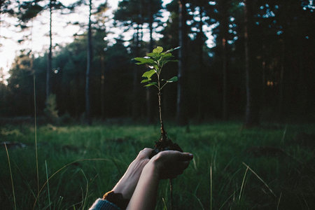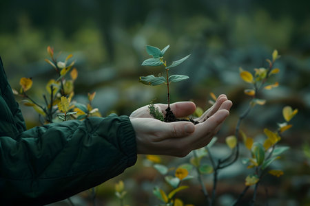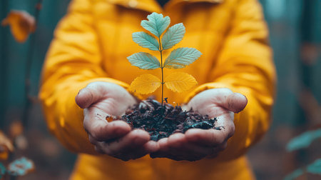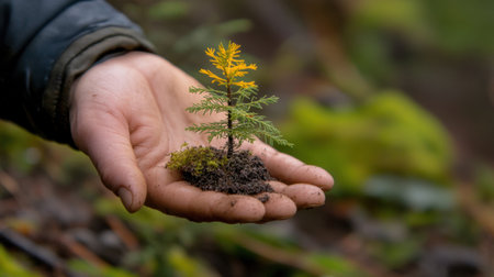 A person holds a small tree with green and yellow leaves, symbolizing growth and a commitment to environmental protection for generations future.