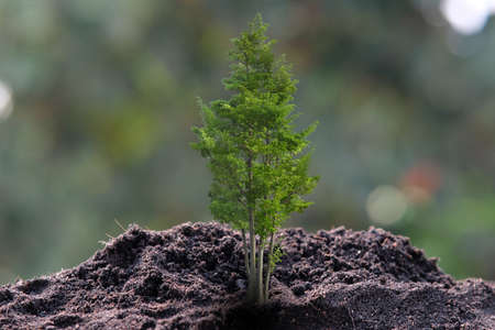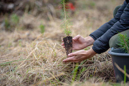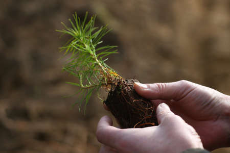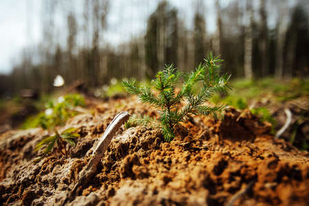 Germinating pine tree sprout, reforestation efforts. Planting new trees, environment care.
