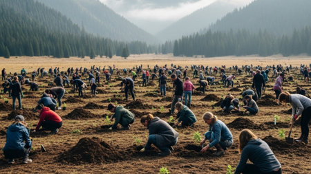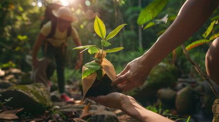 People actively participate in reforestation by planting young trees in a lush forest setting.