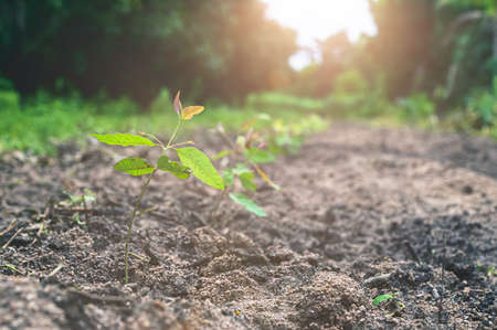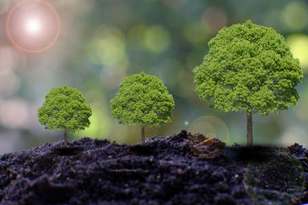 Green tree growing in soil with sunlight background. Ecology and environment concept.