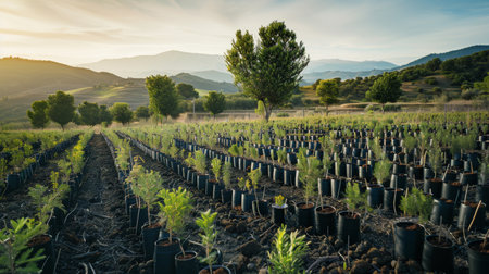 A tree plantation. Furrows with evenly spaced seedlings in black pots. Blurred worker and a valley in the background. Copy space. High quality photo