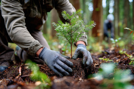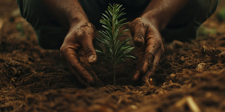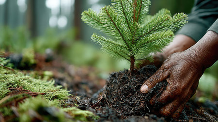 This intimate close-up captures strong, soil-covered hands tenderly planting a fresh fir sapling, symbolizing environmental hope and renewal. Ideal for sustainability ads, conservation posters, reforestation projects, and green initiative visuals.