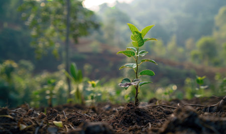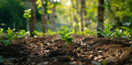 Image features small green trees growing from rich soil, ideal for themes around nature, sustainability, and eco-friendly practices. Perfect for garden, landscape, and environmental projects.