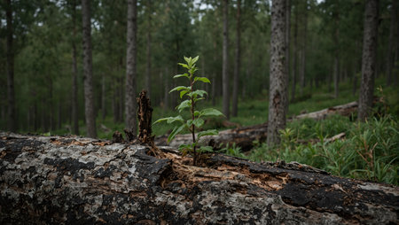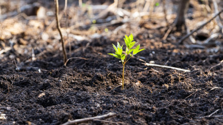 A sapling growing in a small patch of cleared forest floor, surrounded by rich, dark soil and scattered fallen branches, symbolizing new life