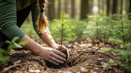 A person is planting a small tree seedling in a forest environment. The image shows close-up hands carefully placing the plant in the ground among moss and fallen leaves. Warm tones, soft lighting, and a shallow depth of field emphasize the subject. This image is suitable for illustrating environmental themes, conservation efforts, and sustainability.