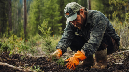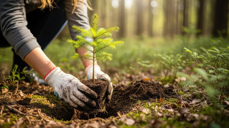 Person planting a young tree seedling in the forest, wearing gloves, promoting environmental conservation and reforestation efforts.