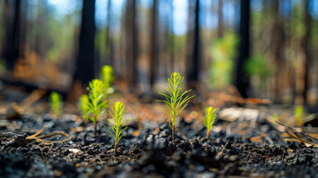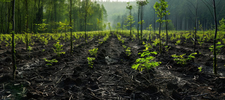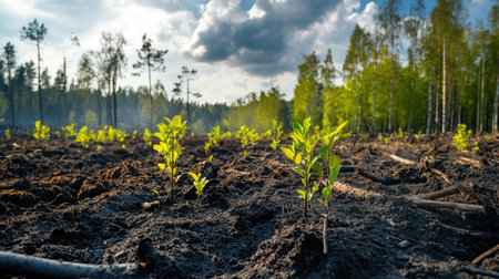 A vibrant scene of young saplings emerging from dark soil in a recovering forest landscape. The interplay of light and shadow highlights nature's resilience and beauty.