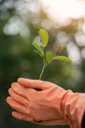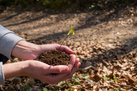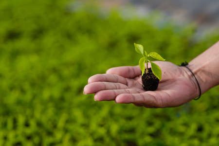 ecological concept nature background Detail of a young man's hand holding a green sapling growing from the soil environment, forest conservation concept.