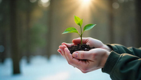 Hands presenting a small green plant growing from soil, representing sustainability, environmentalism, and growth. Bright colors emphasize hope and care for nature.