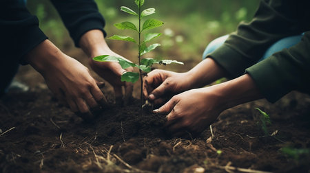 Friends nurture a sapling, their shared act mirroring their growing bond Lush leaves symbolize hope and growth as hands plant it in dark soil This serene natural scene perfectly illustrates environmental awareness, friendship, and the positive impact of collaborative effort, a testament to their shared gratitude AI Generative