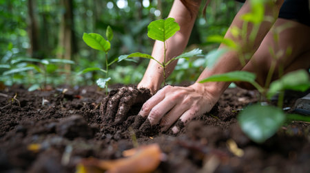 Planting Young Seedling in Nutrient-Rich Soil During Late Afternoon in a Lush Forest