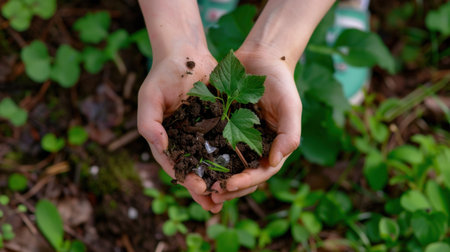 A pair of hands cradles a young plant emerging from rich soil, symbolizing growth and sustainability in nature. Perfect for eco-friendly themes.