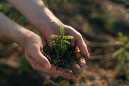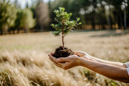 Cupped hands tenderly hold a young evergreen sapling with soil, symbolizing growth, care, and environmental responsibility.