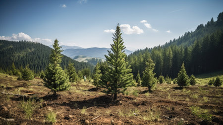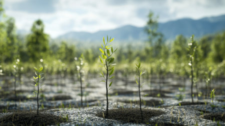 Young saplings grow in rich soil against a backdrop of mountains and blue skies. This image captures the essence of nurturing nature and promoting biodiversity.