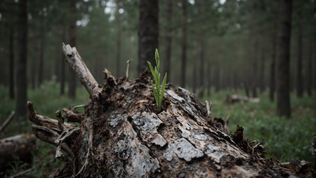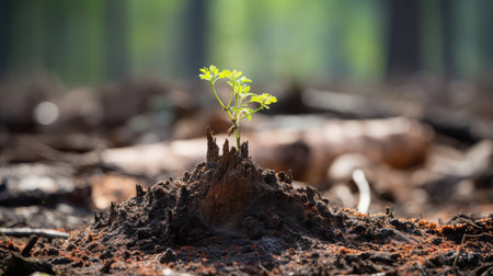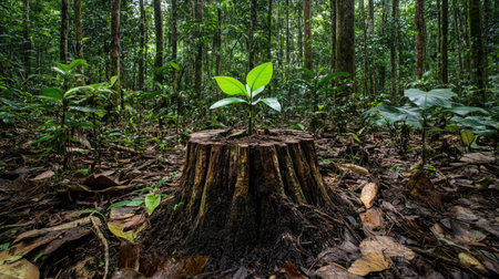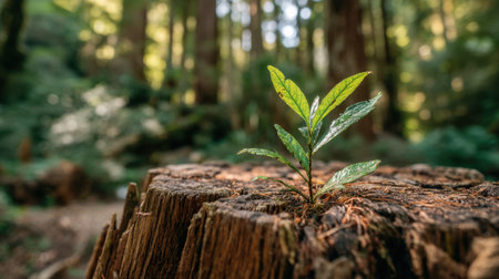 A young plant sprouts from a tree stump in a vibrant forest, symbolizing nature's resilience and renewal. The lush greenery surrounds the scene, highlighting ecological beauty.