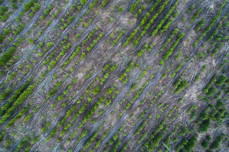 Aerial view of young coniferous trees plantations. Diagonal rows of spruces and felled birch trees among them